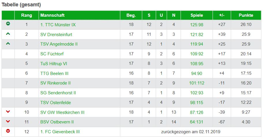 Die in diesen Abschlusstabellen auf den Auf- und Abstiegsplätzen befindlichen Mannschaften steigen auf bzw. ab. Der DTTB und die Landesverbände entscheiden individuell, wie Mannschaften berücksichtigt werden, die sich zum Zeitpunkt des Aussetzens Mitte März auf den Relegationsplätzen befinden. Ihre Entscheidungen darüber wollen die beteiligten Verbände kurzfristig einzeln erarbeiten und veröffentlichen. An den Vorgaben und Terminen der Wettspielordnung zur Planung der Saison 2020/2021 wird zum jetzigen Zeitpunkt festgehalten.