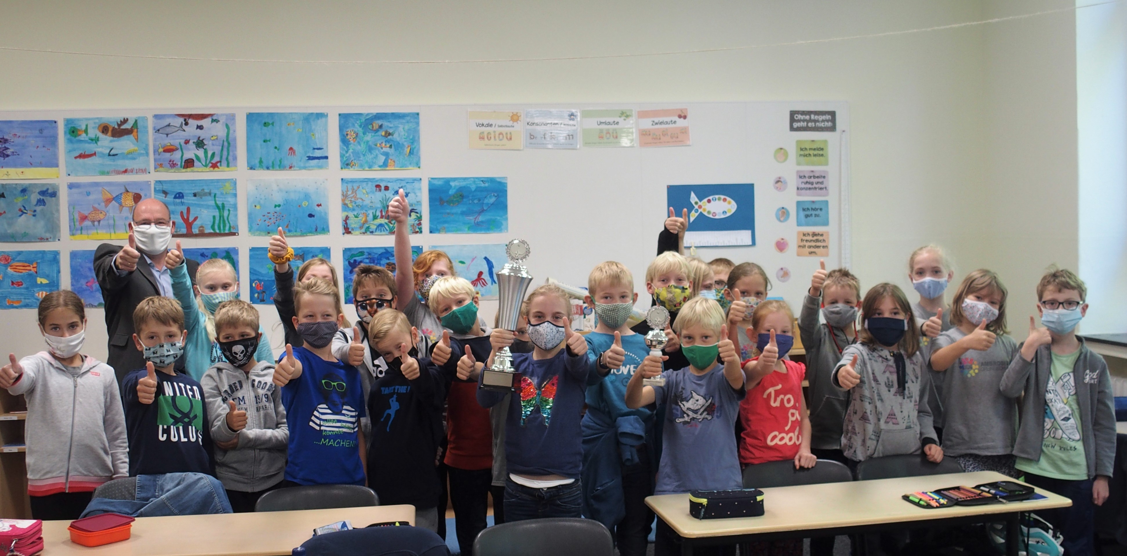 Nun war es endlich soweit. Die Pokalüberreichung für die erfolgreiche Teilnahme der Ambrosiusgrundschule als teilnehmerstärkste Schule und Auszeichnung der Klasse 3 c - jetzt 4 c ließ Corona bedingt und dann folgend von den Sommerferien auf sich warten. Turnierleiter Karl Piochowiak, der in Begleitung von Abteilungsleiter Markus Redbrake die Schule nun aufsuchte, um den Wanderpokal für die Schule und den Besitzpokal für die Klasse zu überreichen, zeigte sich immer noch beeindruckt von der Dynamik und der Power, die von den Kindern ausgeht. Mit derart motivierten Kindern im Rücken muss uns um die sportliche Zukunft nicht bange werden. In diesem Falle ging es um die im Februar stattgefundenen Minimeisterschaften. Damals bereits waren die Mitglieder der Tischtennisabteilung erneut beeindruckt, wie viele Kinder aus den beiden Grundschulen den Weg in die Turnhalle der Josef-Annegarnschule gefunden hatten, um an der Veranstaltung teilzunehmen. Kleiner Anreiz neben der Möglichkeit, den Tischtennissport wie die Großen in der Turnhalle unter echten Wettkampfbedingungen kennen zu lernen ist auch die Auszeichnung der Platzierten sowie die Vergabe der Schulpokale. Diese, so versprach Schulleiterin Andrea Winter, werden würde Plätze in den Vitrinen der Schule finden. Die TT-Abteilung hofft im neuen Jahr auf eine Neuauflage und ebenso dynamische Kids als Teilnehmer.