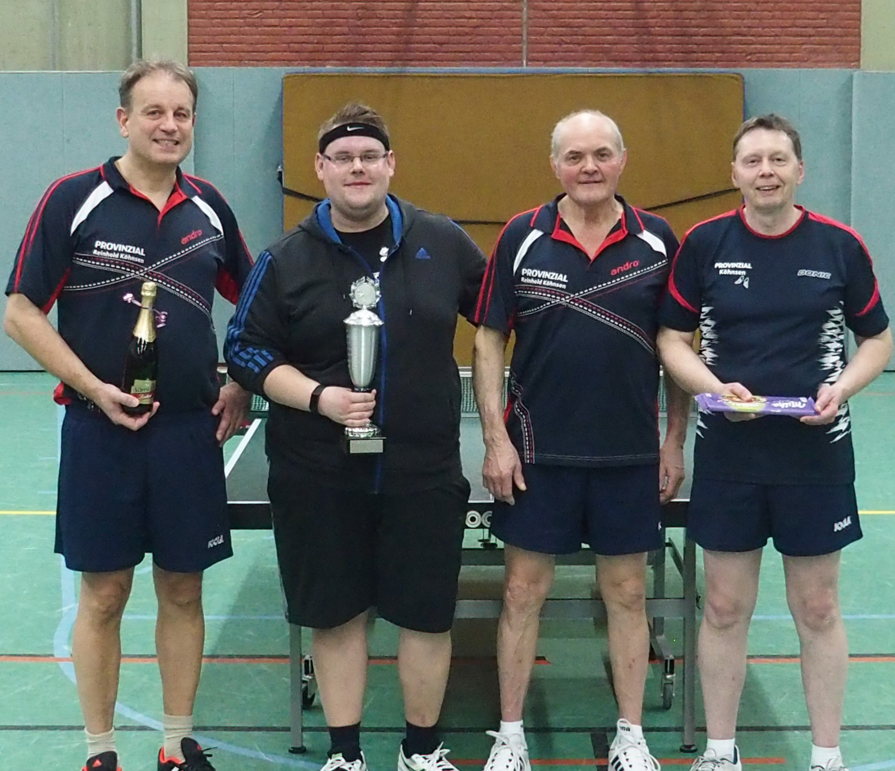 Es geht ja nur darum, im Kreise der Aktiven und der Ehemaligen ein wenig Spaß zu haben bei dem Sport, der sie alle verbindet. Dem Tischtennissport. Aber ein bisschen gewinnen will doch jeder und warum auch nicht. Das Zweiermannschaftsturnier mit mittlerweile Kultstatus, immer direkt nach Weihnachten durchgeführt lockt in die Halle. Wirklich anmelden muss sich keiner. Doch gibt es auch Stammgäste, die einfach nicht fehlen dürfen. Das sind dann seltener die noch in Reihen des BSV in der ersten oder zweiten Mannschaften aktiven, die nehmen die Veranstaltung ohnehin als gelungenen Trainingsabend für den Start in die Rückrunde, sondern vielmehr diejenigen, die oft von weit her anreisen. Den weitesten Weg nahm dabei erneut Holger Wieczorek auf sich, der als Teil des damaligen Dream-Teams in der Oberliga mit Routinier Markus Redbrake aufschlug. Aber auch Daniel Berges nahm den Weg aus dem entfernt gelegenen Wismar auf sich, um dabei zu sein. Die Wiedersehensfreude ist also immer groß. Zum Turnierinventar gehört aber vor allem Gunnar Schubert, der nicht nur jedesmal teilnimmt, zudem auch regelmäßig um die Titelvergabe mitspielte. Dass es diesmal nicht auf das Treppchen ging, störte weder ihn noch seinen zugelosten Partner. Für ihn war diesmal an der Seite eben von Holger Wieczorek Schluss im Halbfinale gegen die späteren Sieger Stefan Kroes und Dirk Bauer. Die zweite Paarung der Halbfinals in dem wieder einmal sehr ausgeglichen besetzten Feld stellten Markus Redbrake an der Seite von Alfons Dartmann und Phillipp Neumeister mit Klaus Mühlenstroth. Redbrake und Dartmann behielten in ihren Einzeln eine reine Weste und durften dann auch ran im Endspiel. Dort ließen sich aber Stefan Kroes und Dirk Bauer die Butter nicht mehr vom Brot nehmen. Die weiteren Teilnehmenden waren: Marcus Birke, Stephan Birke, Daniel Kather, Karl Piochowiak und Martin Schwegmann.