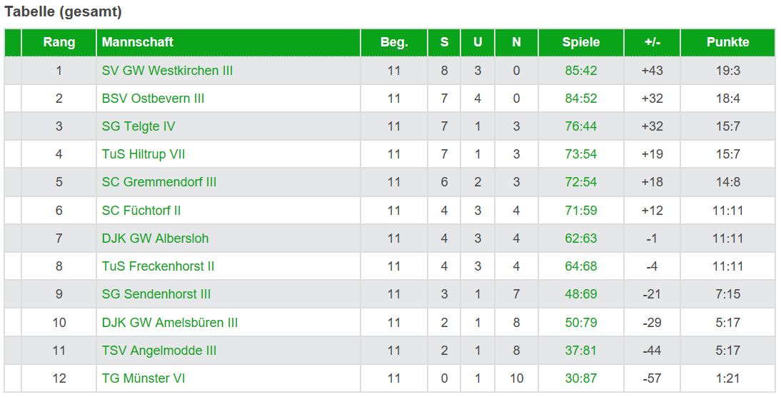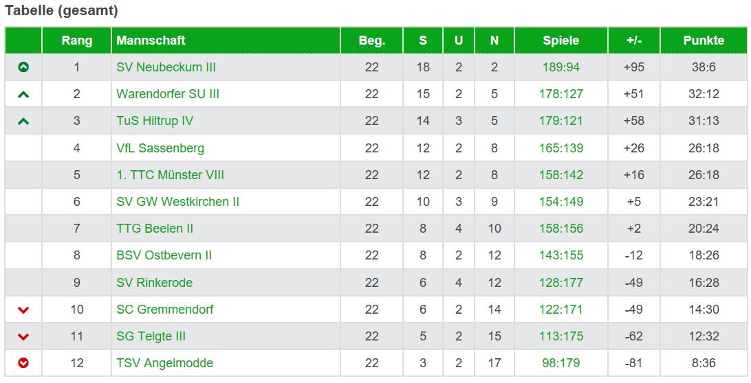 Da die Verfolger aus Gremmendorf in Warendorf verloren, können diese die Beveraner nicht mehr einholen. Telgte könnte es theoretisch noch schaffen, hat aber ein schweres Restprogramm. Zunächst in der kommenden Woche gegen den Drittplatzierten aus Hiltrup und am Freitag zum Abschluss ab 18:30 Uhr beim BSV. Damit hat es, falls notwendig, das Sextett von der Bever gegen die Emsstädter selber in der Hand, endgültig für den Klassenerhalt zu sorgen. Nun denn! Und by the way: Das Team krabbelte zumindest nominell in der Tabelle auch am punktgleichen SV Rinkerode vorbei, noch gegen Hiltrup und die bereits zur Relegation verdammten Gremmendorfer spielen müssen. Also auch hier keine Langeweile in den letzten Partien.